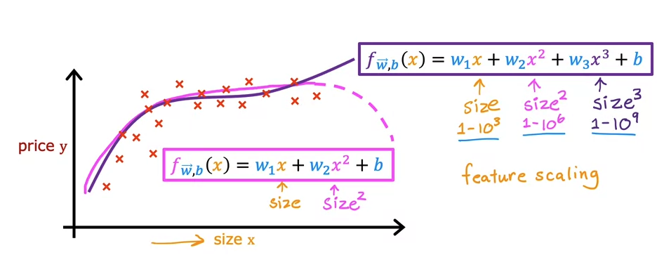 We can use feature engineering by multiplying x by exponents. But now x has a different scale of value than the original x. This is where feature scaling comes to play its job. We need to rescale the data for better gradient descent performance.