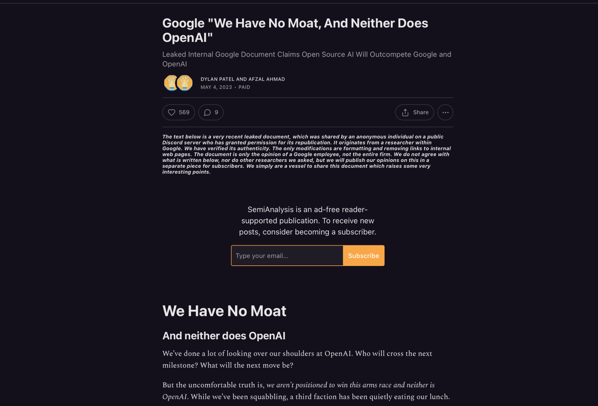 오픈소스가 Closed Source 모델보다 좋다면 기업들은 자기만의 언어모델에 대한 이점이 사라지는것이다. 실제로 구글 관계자가 쓴 이와 관련된 글이 유출되었다.
